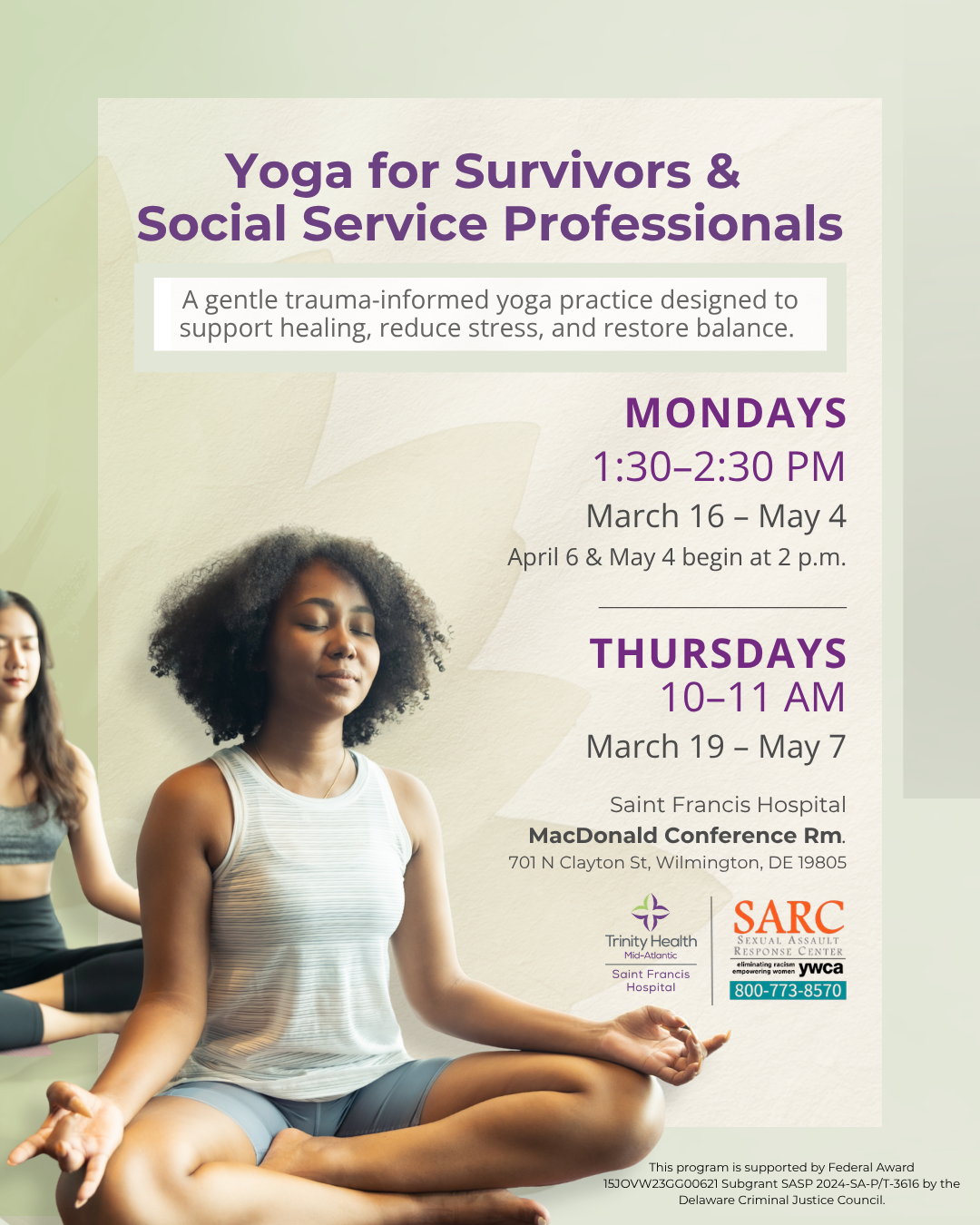 YWCA Delaware's Sexual Assault Response Center (SARC) is offering free, trauma-informed yoga classes this spring for survivors and social service professionals.